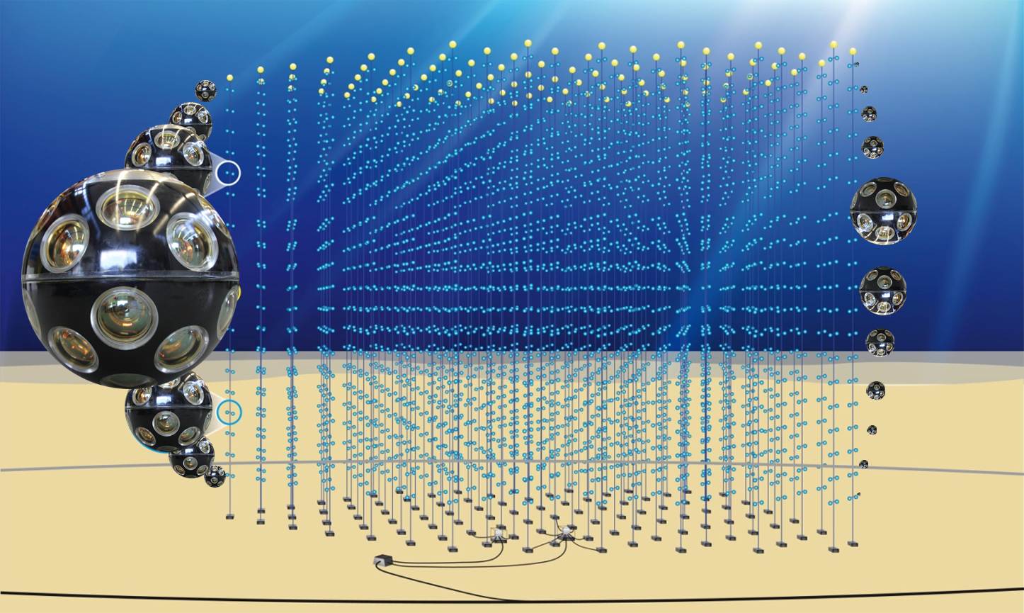 სურათი 2. KM3NeT დეტექტორის გრაფიკული სქემა. დეტექტორის ხაზები შეერთებულია ზღვის ფსკერზე მოთავსებულ შემაერთებელ კვანძთან, რომლის საშუალებით დეტექტორს მიეწოდება ელექტრული კვება, ხოლო სენსორების სიგნალები ნაპირზე განლაგებულ დეტექტორის მართვის ცენტრს გადაეცემა.